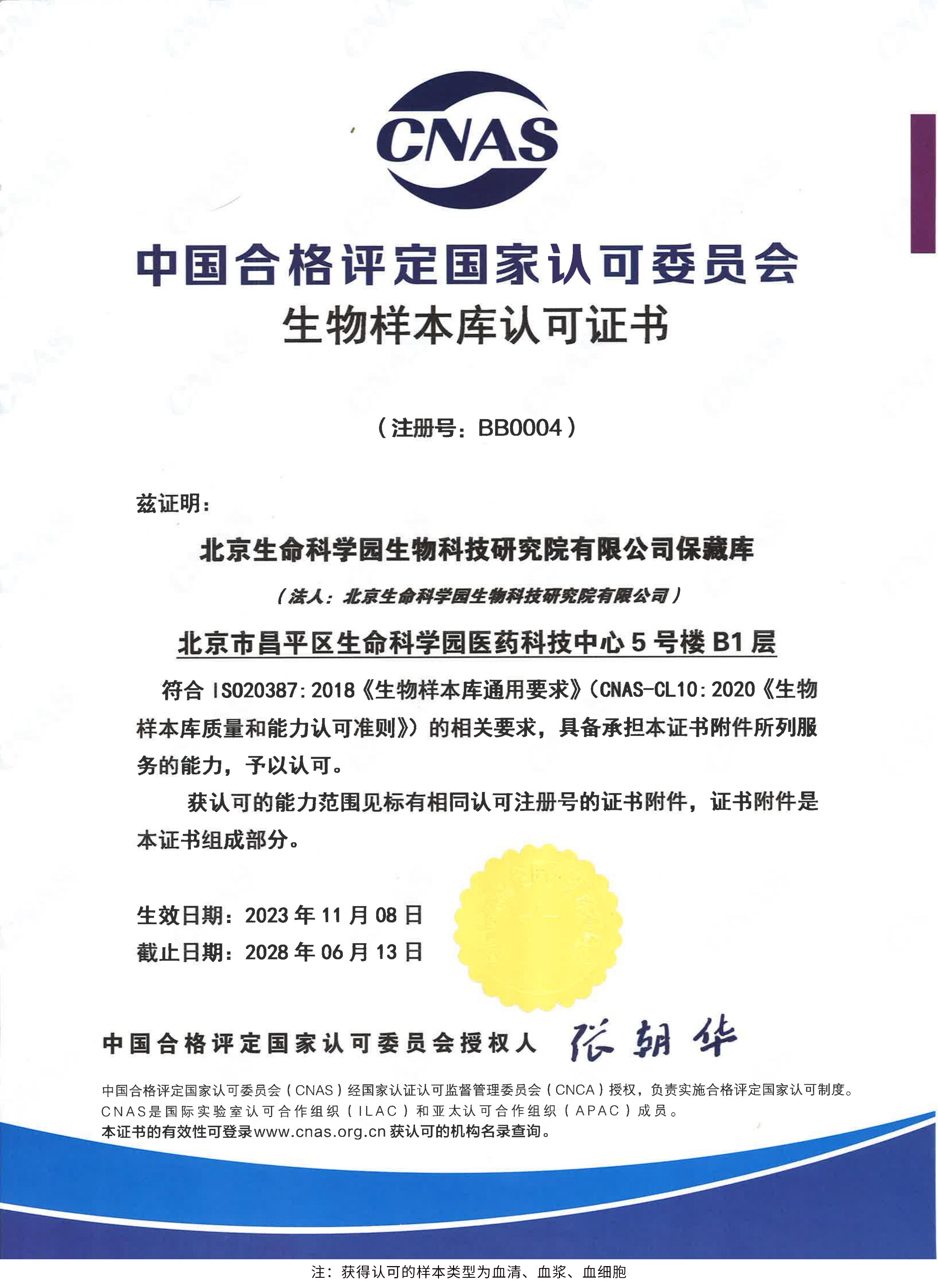 北京生命科學(xué)園生物科技研究院(以下簡(jiǎn)稱(chēng)“北京生物樣本資源庫(kù)”)(Biobank of Life Science Park,簡(jiǎn)寫(xiě)“BoLSP”)是一家由北京市科委和中關(guān)村生命科學(xué)園共同支持設(shè)立的第三方生物樣本庫(kù)公共服務(wù)平臺(tái),秉承北京重大疾病臨床數(shù)據(jù)和樣本資源庫(kù)(以下簡(jiǎn)稱(chēng)“北京庫(kù)”)(Beijing Biobank of Clinical Resources,BBCR)十余年的發(fā)展成果,聚合眾多臨床樣本專(zhuān)家的專(zhuān)業(yè)共識(shí),致力于在生命科學(xué)、生物醫(yī)藥研究領(lǐng)域發(fā)揮銜接樣本資源持有者與研究者的橋梁作用,解決生物樣本資源開(kāi)發(fā)上下游信息不對(duì)稱(chēng)、資源共享困難等問(wèn)題。研究院在北京中關(guān)村生命科學(xué)園昌平園區(qū)建立了2000㎡生物樣本庫(kù),最大存儲(chǔ)規(guī)模達(dá)1000萬(wàn)份。研究院遵循CNAS-CL10:2020《生物樣本庫(kù)質(zhì)量和能力認(rèn)可準(zhǔn)則》,同時(shí)結(jié)合北京庫(kù)過(guò)去十年的工作經(jīng)驗(yàn)與教訓(xùn),建立了一套完善的生物樣本保藏質(zhì)量管理體系,從人、機(jī)、料、法、環(huán)、控多個(gè)角度,實(shí)現(xiàn)生物樣本保藏過(guò)程的全面質(zhì)量控制,先后獲得國(guó)家科技部頒發(fā)的人類(lèi)遺傳資源保藏行政許可證書(shū)和中國(guó)合格評(píng)定國(guó)家認(rèn)可委員會(huì)(China National Accreditation Service for Conformity Assessment,CNAS)頒發(fā)的“CNAS認(rèn)可證書(shū)”。